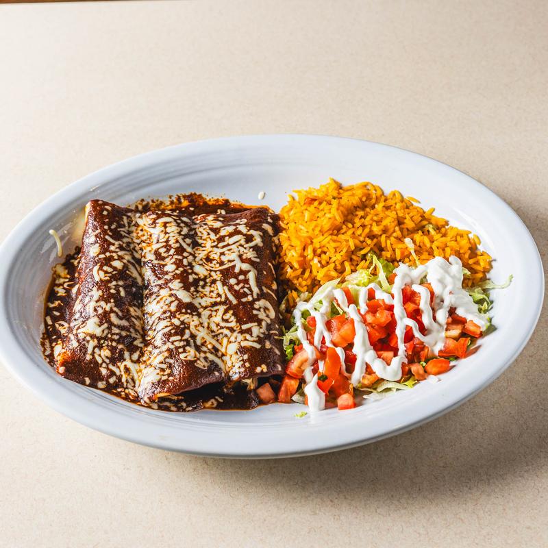 2 chicken enchiladas topped with cheese and green sauce. Served with Spanish rice.