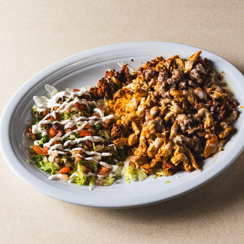 Toasted corn tortilla chips covered with melted cheese, beef, chicken and beans. Topped with shredded lettuce, tomatoes and sour cream.