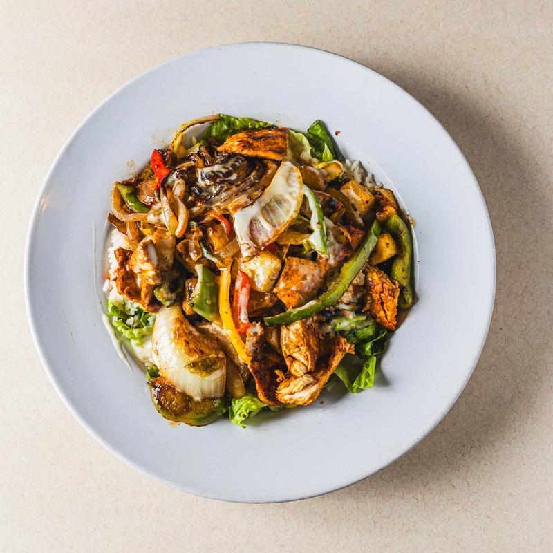 Steak or chicken grilled with rainbow peppers, onions and tomatoes. Served with rice, beans, lettuce, tomatoes, sour cream, grated cheese and flour tortillas.