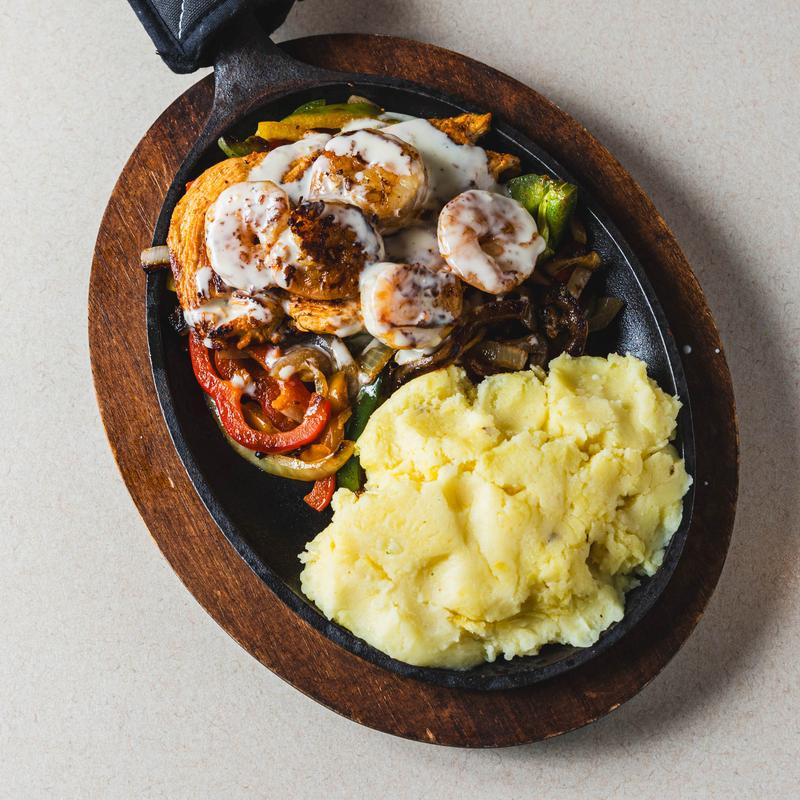 Grilled chicken and chorizo on a bed of romaine lettuce. Served with black beans and white rice, garnished with queso sauce, pico de gallo.