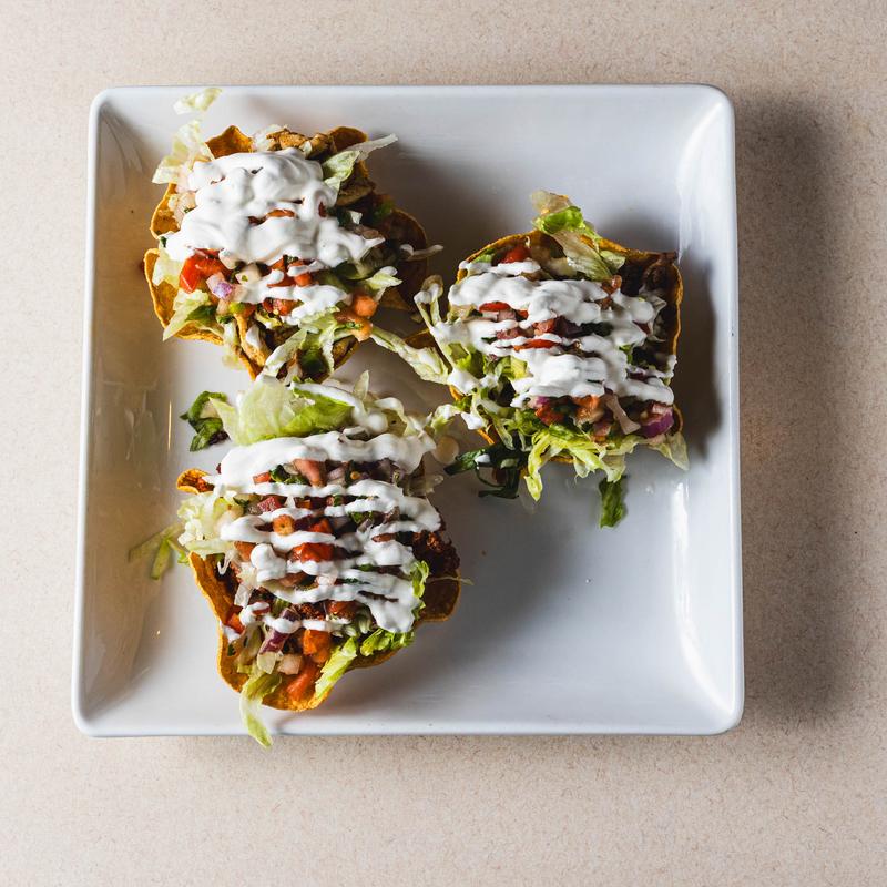Crispy flour tortilla shell filled with ground beef, fried beans, lettuce, tomatoes, grated cheese and sour cream.